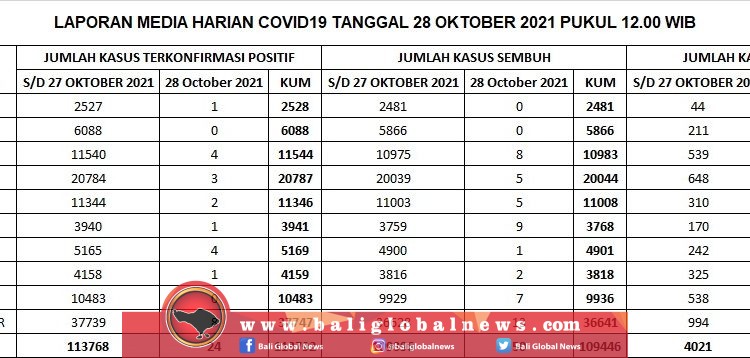 Pertambahan kasus terkonfirmasi positif Covid-19 di Provinsi Bali pada Rabu (27/10) tercatat 24 orang, pasien sembuh 50 orang dan nihil pasien meninggal dunia.