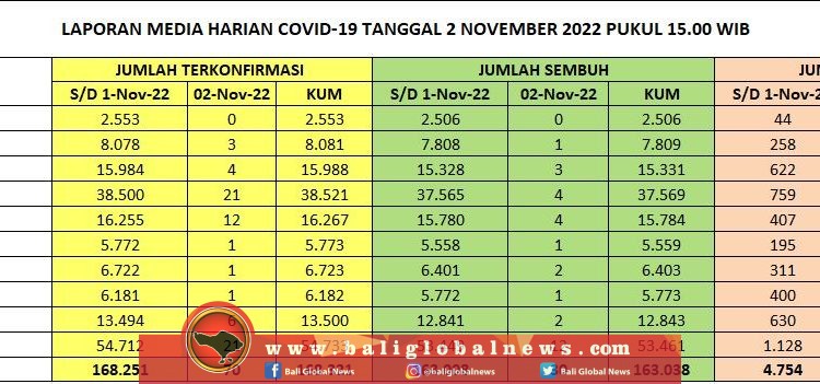 Pertambahan kasus terkonfirmasi positif Covid-19 di Provinsi Bali pada Rabu (2/11/2022) tercatat 70 orang, pasien sembuh 30 dan 1 orang meninggal dunia.