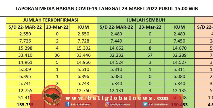 Pertambahan kasus terkonfirmasi positif Covid-19 di Provinsi Bali pada Rabu (23/3) tercatat 70 orang, pasien sembuh 95 dan 0 meninggal dunia.