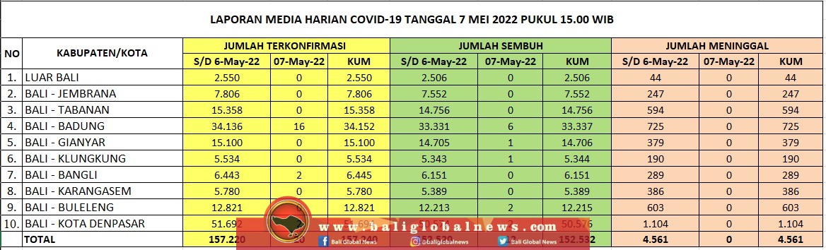 Pertambahan kasus terkonfirmasi positif Covid-19 di Provinsi Bali pada Sabtu (7/5) tercatat 20 orang, pasien sembuh 12 dan nihil meninggal dunia.