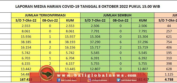 Pertambahan kasus terkonfirmasi positif Covid-19 di Provinsi Bali pada Sabtu (8/10/2022) tercatat 22 orang, pasien sembuh 15 dan nihil meninggal dunia.