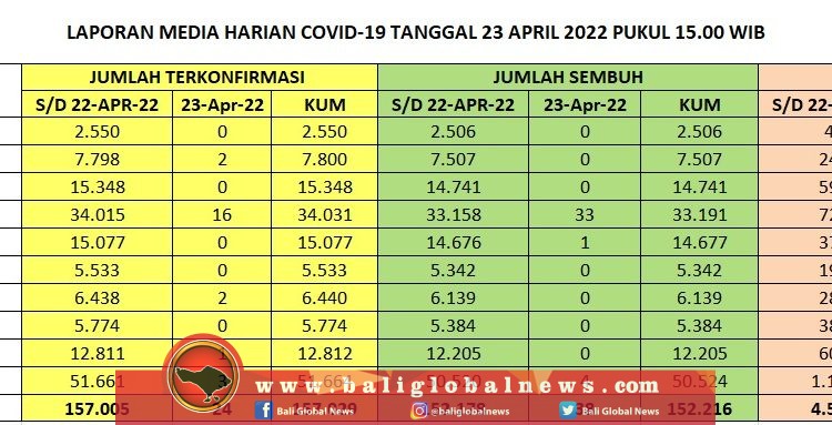 Pertambahan kasus terkonfirmasi positif Covid-19 di Provinsi Bali pada Sabtu (23/4) tercatat 24 orang, pasien sembuh 38 dan 1 meninggal dunia.