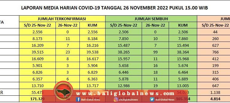 Pertambahan kasus terkonfirmasi positif Covid-19 di Provinsi Bali pada Sabtu (26/11/2022) tercatat 96 orang, pasien sembuh 239 dan 3 orang meninggal dunia.