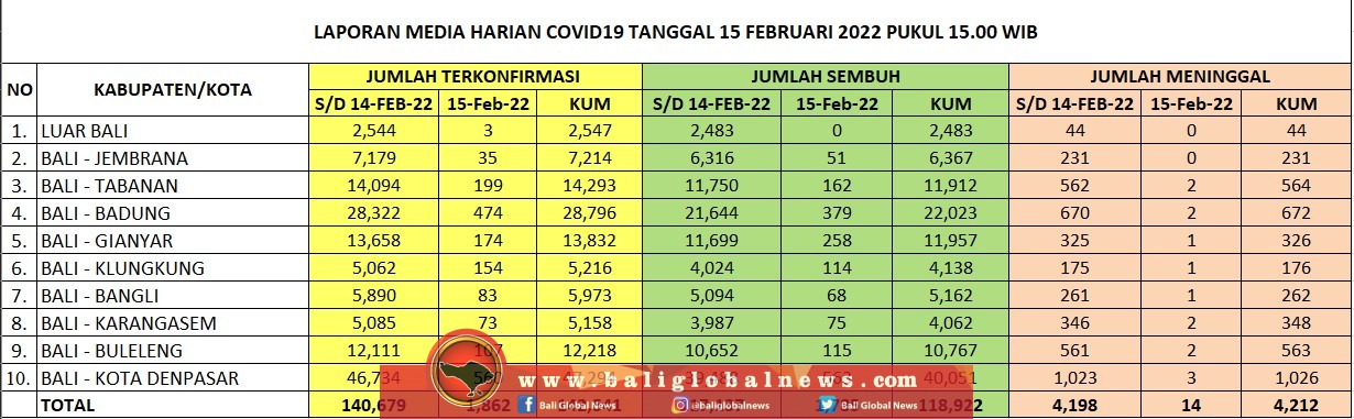 Pertambahan kasus terkonfirmasi positif Covid-19 di Provinsi Bali pada Selasa (15/2) tercatat 1.862 orang, pasien sembuh 1.785 dan 14 meninggal dunia.