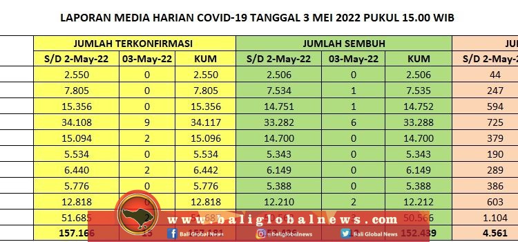 Pertambahan kasus terkonfirmasi positif Covid-19 di Provinsi Bali pada Selasa (3/5) tercatat 15 orang, pasien sembuh 13 dan nihil meninggal dunia.
