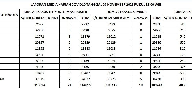Pertambahan kasus terkonfirmasi positif Covid-19 di Provinsi Bali pada Selasa (9/11) tercatat 21 orang, pasien sembuh 10 orang dan 1 pasien meninggal dunia.