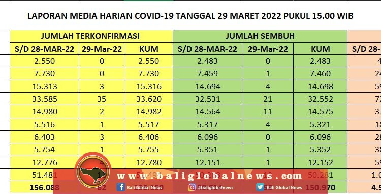 Pertambahan kasus terkonfirmasi positif Covid-19 di Provinsi Bali pada Selasa (29/3) tercatat 62 orang, pasien sembuh 56 dan 2 meninggal dunia.
