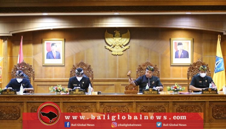 Dewan Perwakilan Rakyat Daerah (DPRD) Kabupaten Badung menggelar rapat purna di Ruang Sidang Utama Gosana Sekretariat DPRD Puspem Badung, Kamis (14/10). Rapat paripurna yang dilaksanakan dengan hybrid dipimpin Ketua DPRD Badung Putu Parwata didampingi Wakil Ketua DPRD Wayan Suyasa dan Made Sunarta mengagendakan penjelasan Bupati Badung, I Nyoman Giri Prasta, terhadap Ranperda APBD TA 2022 dan beberapa ranperda yakni ranperda tentang Penjabaran APBD Tahun Anggaran 2022, Ranperda tentang Penyelenggaraan Penanaman Modal, Ranperda tentang Retribusi Perpanjangan Pengesahan Rencana Penggunaan Tenaga Kerja Asing, Ranperda tentang Retribusi Persetujuan Bangunan Gedung, ranperda tentang Pencabutan Perda Kabupaten Badung Nomor 7 tahun 2018 tentang RDTR dan Peraturan Zonasi Kecamatan Kuta Selatan tahun 2018- 2038, Ranperda tentang Perubahan Atas Perda Nomor 1 Tahun 2020 tentang Pembentukan Perangkat Daerah Badan Kesatuan Bangsa dan Politik, Ranperda tentang Pencabutan Perda Kabupaten Badung nomor 24 tahun 2011 tentang Retribusi Pelayanan Kesehatan dan Ranperda tentang Pencabutan Perda Kabupaten Badung Nomor 1 Tahun 2015 tentang Pendirian dan Pengelolaan Badan Usaha Milik Desa.