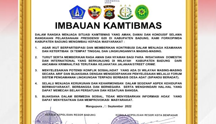 Forum Koordinasi Pimpinan Daerah (Forkopimda) Kabupaten Badung mengeluarkan imbauan bersama yakni “Imbauan Kamtibmas” dalam upaya menjaga situasi kamtibmas yang aman, damai dan kondusif selama rangkaian pelaksanaan KTT Presidensi G20.
