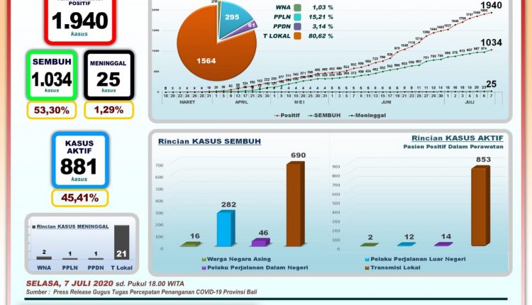 ”Hari ini (Selasa, 7/7 – red) ada penambahan pasien positif 40 orang WNI yang terdiri dari 39 orang transmisi lokal dan 1 orang pelaku perjalanan luar negeri. Secara kumulatif jumlahnya menjadi 1.940 orang,” ujarnya.