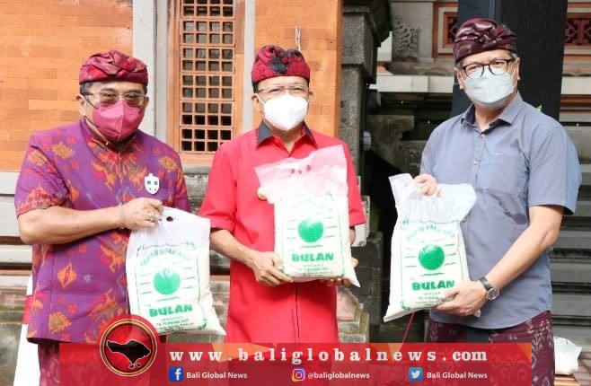 Gubernur Bali, Wayan Koster, menerima bantuan 60 ton beras dari Otoritas Jasa Keuangan (OJK), Forum Komunikasi Lembaga Jasa Keuangan (FKLJK) Provinsi Bali dan industri secara mandiri di Jaya Sabha, Denpasar, pada Kamis (7/10). Bantuan beras itu nantinya akan diserahkan langsung kepada kepala desa atau bendesa adat se-Bali untuk kemudian diserahkan kepada masing-masing warga di wilayahnya.
