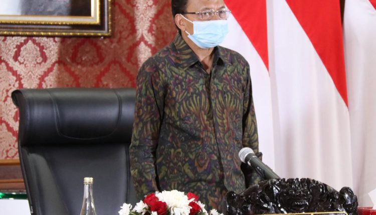 Gubernur Bali, Wayan Koster, mengikuti pelantikan dan serah terima jabatan (Sertijab) Pemimpin Satuan Kerja (Satker) di lingkungan Otoritas Jasa Keuangan (OJK) yang dilaksanakan secara virtual dari Ruang Rapat Gedung Gajah, Jayasabha, Denpasar, Senin (26/10).
