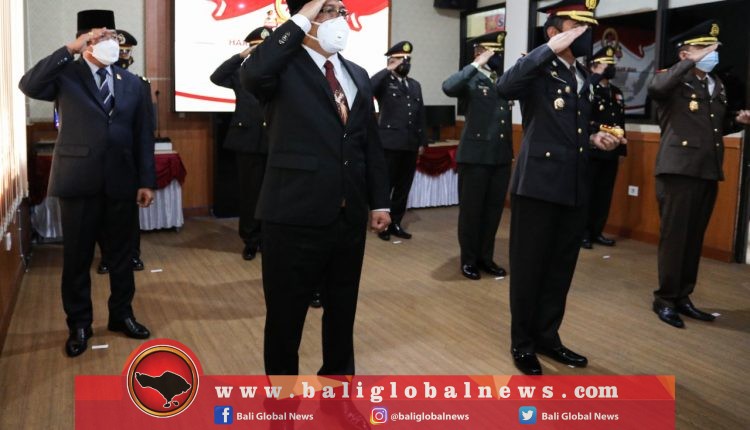Bupati Badung, Nyoman Giri Prasta, bersama Kapolres Badung, AKBP Roby Septiadi; Kajari Badung, Ketut Maha Agung; Wakil Ketua II DPRD Badung, Made Sunarta, beserta jajaran Forkopimda Badung mengikuti perayaan Hari Bhayangkara ke-75 dari ruang monitoring center Polres Badung, Kamis (1/7).