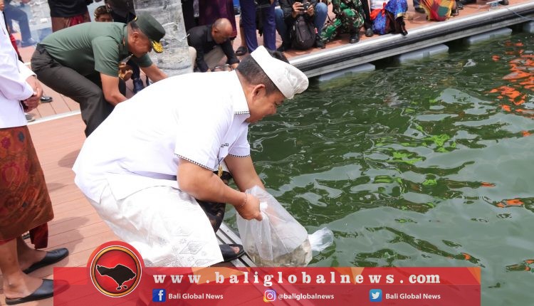 Hadiri Karya Bakti Kodam IX/Udayana, Pj. Gubernur Bali Tuang Cairan Eco Enzim dan Tebar Benih Ikan di Danau Batur