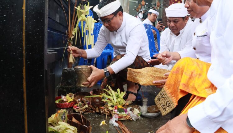 Wakil Walikota Denpasar I Kadek Agus Arya Wibawa menghadiri pelaksanaan pujawali di Banjar Tegallinggah, Padangsambian, pada Rahina Tumpek Landep, Sabtu (22/2/2025). Acara ini juga dirangkaikan dengan upacara melaspas tembok penyengker banjar setempat. Wawali Arya Wibawa melakukan prosesi mendem dasar tembok penyengker banjar tersebut.