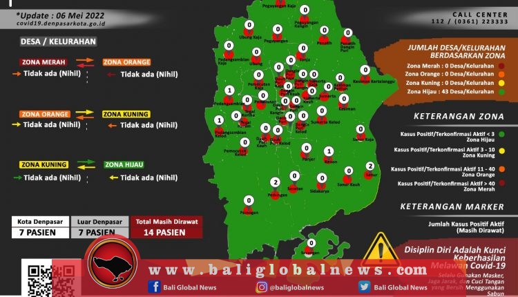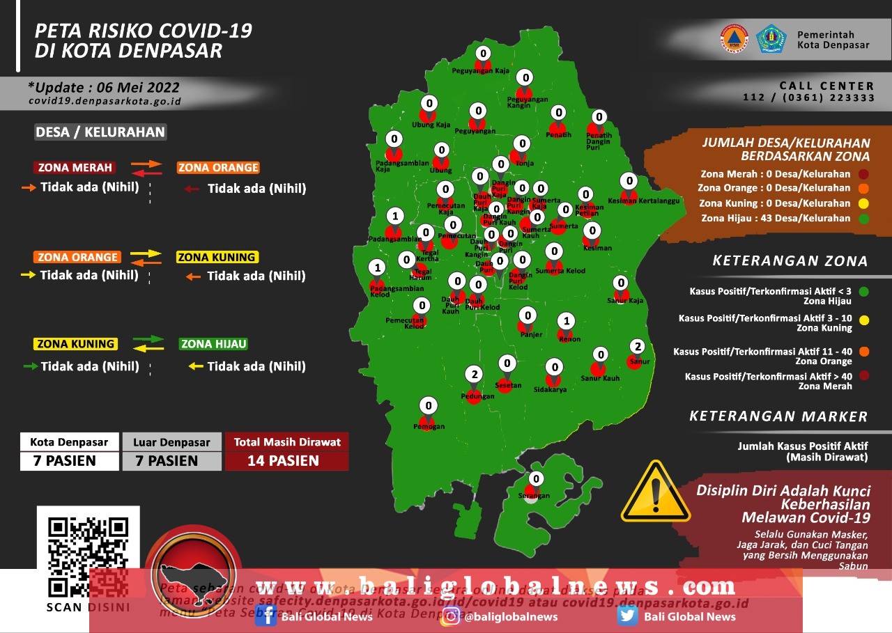 Dia merinci 5 desa/kelurahan yang masih memiliki kasus aktif yakni Kelurahan Padangsambian 1 kasus, Padangsambian Kelod 1, Pedungan 2, Renon 1 kasus dan Kelurahan Sanur 2 kasus. “Meskipun semua wilayah sudah zona hijau, kasus masih ada. Jadi prokes itu tetap. Jangan sampai meledak lagi kasusnya gara-gara abai prokes,” katanya.