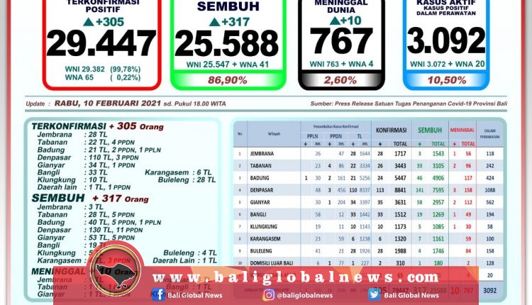 Perkembangan pandemi Covid-19 di Provinsi Bali pada Rabu (11/2) terkonfirmasi positif 305 orang (293 orang melalui transmisi lokal, 11 PPDN dan 1 PPLN), sembuh 317 orang dan 10 orang meninggal dunia.
