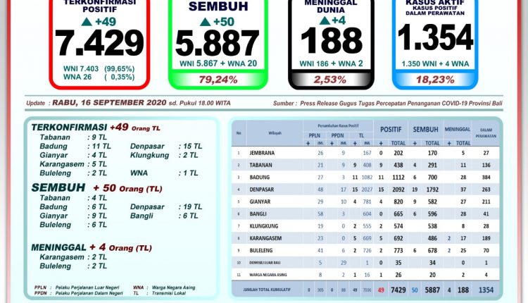 Perkembangan pandemi Covid-19 di Bali pada Rabu (26/9) terkonfirmasi 49 orang melalui transmisi lokal, sembuh 50 orang, dan meninggal dunia 4 orang.