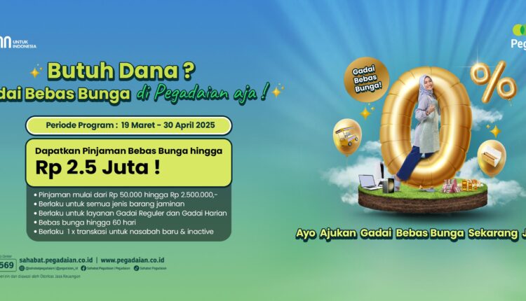 “Nasabah dapat memperoleh pinjaman mulai dari Rp50 ribu – Rp2,5 juta dengan fasilitas bebas bunga sampai dengan 60 hari. Pada program Gadai Bebas Bunga ini nasabah bisa menjaminkan berbagai agunan seperti emas batangan dan perhiasan, kendaraan bermotor, hingga barang elektronik. Barang elektronik yang dapat dijaminkan meliputi handphone , laptop, tablet, kamera, televisi atau barang elektronik lainnya,” kata Direktur Utama PT Pegadaian Damar Latri Setiawan pada Sabtu (22/3/2025).