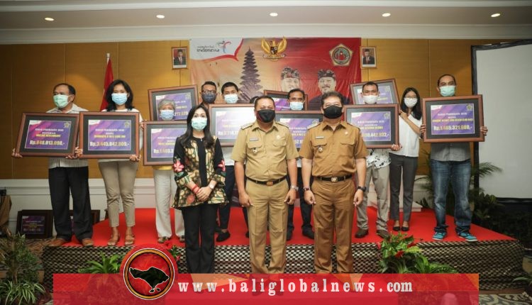 Gianyar menjadi kabupaten pertama di Indonesia yang mencairkan hibah pariwisata kepada 160 wajib pajak hotel dan restoran, di Rumah Luwih, Desa Lebih, Senin (16/11).