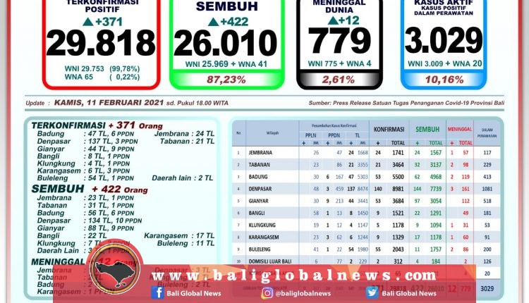 Perkembangan pandemi Covid-19 di Provinsi Bali pada Kais(11/2) terkonfirmasi 371 orang (347 orang melalui transmisi lokal dan 24 PPDN), sembuh 422 orang dan 12 orang meninggal dunia.
