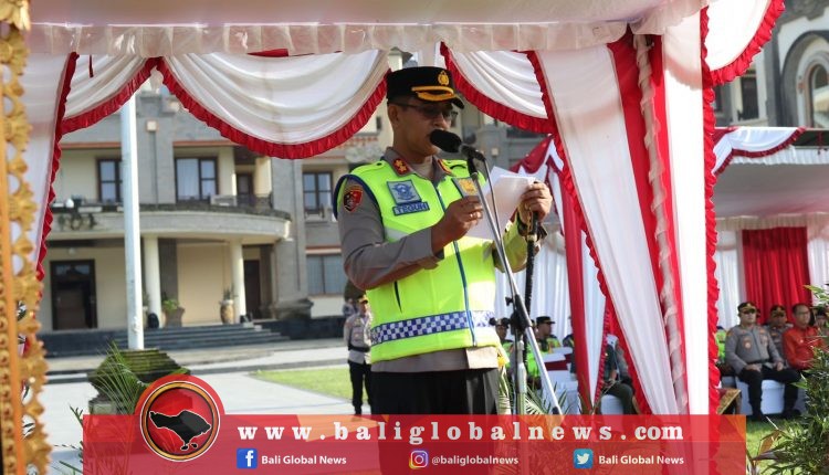 Kepala Kepolisian Resor (Kapolres) Badung, AKBP Teguh Priyo Wasono, memimpin apel pengamanan pergeseran pasukan (Serpas) Tahap Pemungutan Suara Pemilu 2024 di Lapangan Puspem Badung, pada Selasa (13/2/2024) pukul 07.30 Wita.