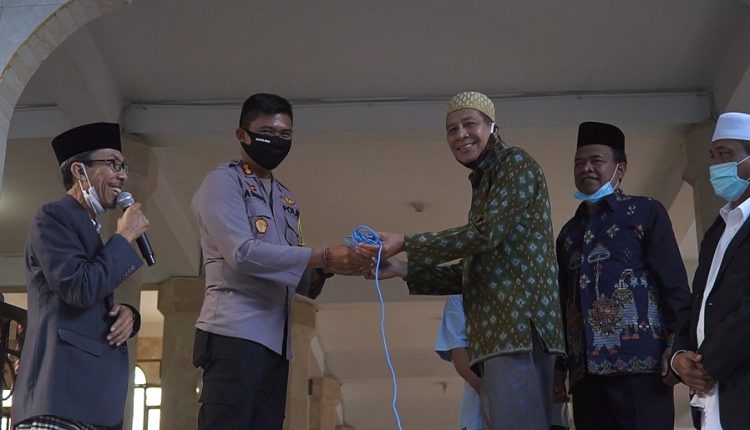 Kapolres Bangli, ABKP I Gusti Agung Dhana Aryawan, S.I.K.,M.I.K., menyerahkan dua ekor kambing kepada panitia kurban dalam rangka hari raya Idul Adha di Masjid Agung Bangli, Jumat (31/7).