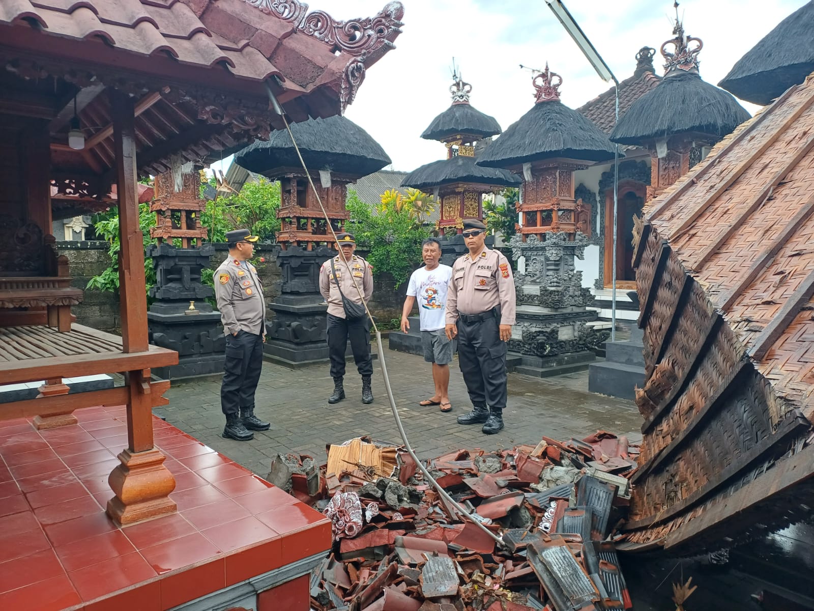 Kapolsek Kompol I Ketut Adnyana mengatakan pada Rabu (30/10/2024) malam wilayah hukum Polsek Mengwi diguyur hujan lebat disertai angin kencang yang menyebabkan warga lingkungan Banjar Ubung dan Uma Gunung, Kelurahan Sempidi, terdampak bencana alam yang mengakibatkan robohnya bangunan tempat suci (sanggah), tembok penyengker, kanopi dan atap rumah