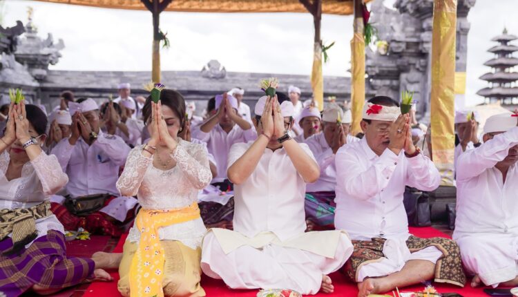 Bupati Badung I Wayan Adi Arnawa bersama istri sembahyang sekaligus ngupasaksi karya melaspas, penyengker, candi, dan kereb bangunan di Pura Pedharman Sira Arya Kanuruhan, Arya Brangsinga, Arya Tangkas, Arya Pagetapan, di Banjar Dinas Besakih Kangin, Desa Besakih, Rendang, Karangasem, pada Rabu (2/4/2025).