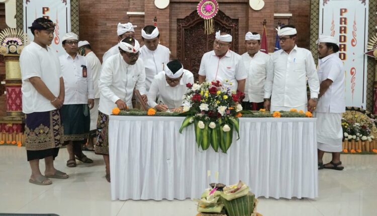 Bupati Badung l Wayan Adi Arnawa menghadiri karya ngenteg linggih dan padudusan alit Banjar Anyar sekaligus perayaan Hari Ulang Tahun (HUT) ke-40 Seka Teruna Yowana Yadnya Patni, Banjar Anyar, Kelurahan Tanjung Benoa, Kuta Selatan, Badung, pada Kamis (10/7/2025). Sebagai bentuk dukungan dan perhatian terhadap pelaksanaan karya dan HUT ST Yowana Yadnya Patni, Bupati Adi Arnawa membantu dana Rp50 juta yang diterima panitia karya l Wayan Ganti Artana. Bupati juga menandatangani prasasti dan memotong tumpeng.