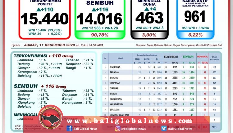 Perkembangan pandemi Covid-19 di Provinsi Bali pada Jumat (11/12/2020) masih bertengger di angka tiga digit. Pada hari ini terkonfirmasi 110 orang (107 orang melalui transmisi lokal dan 3 PPDN), sembuh 116 orang, dan 4 orang meninggal dunia.