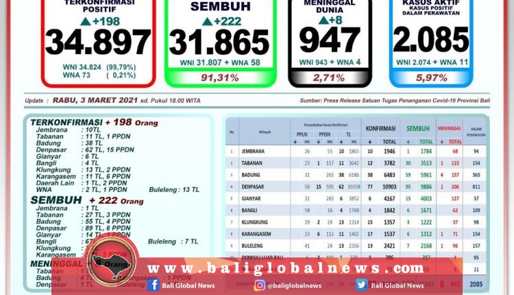 Perkembangan kasus Covid-19 di Provinsi Bali pada Rabu (3/3) terkonfirmasi 198 orang (171 orang melalui transmisi lokal dan 27 PPDN), sembuh 222 orang, dan 8 orang meninggal dunia.