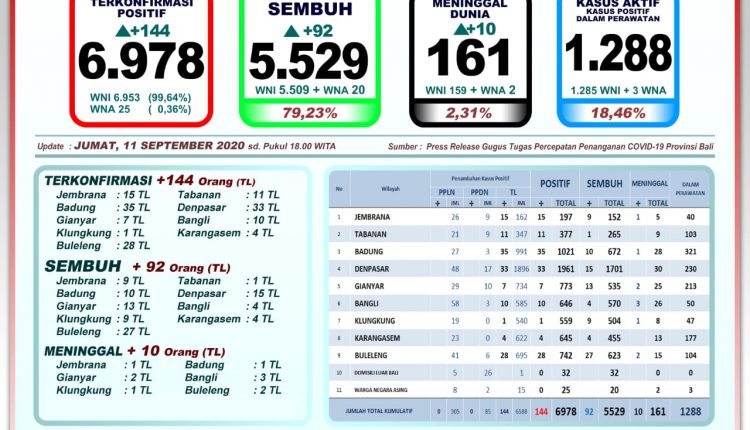 Perkembangan pandemi Covid-19 di Provinsi Bali pada Jumat (11/9) terkonfirmasi 144 orang melalui transmisi lokal, sembuh 92 orang, dan 10 pasien meninggal dunia.Secara kumulatif kasus terkonfirmasi positif menjadi 6.978 orang, sembuh 5.529 orang (79,23%), dan pasien meninggal dunia menjadi 161 orang (2,31%).