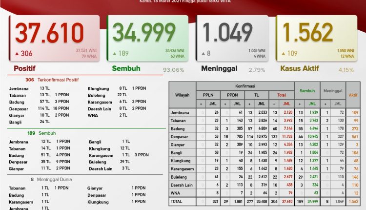 Pertambahan kasus terkonfirmasi positif di Provinsi Bali pada Kamis (18/3) tercatat 306 orang (277 orang melalui transmisi lokal dan 29 PPDN), sembuh 189 orang, dan 8 orang meninggal dunia. Jumlah kasus secara kumulatif terkonfirmasi 37.610 orang, sembuh 34.999 orang (93,06%), dan meninggal dunia 1.049 orang (2,79%). Kasus aktif per hari ini menjadi 1.562 orang (4,15%).