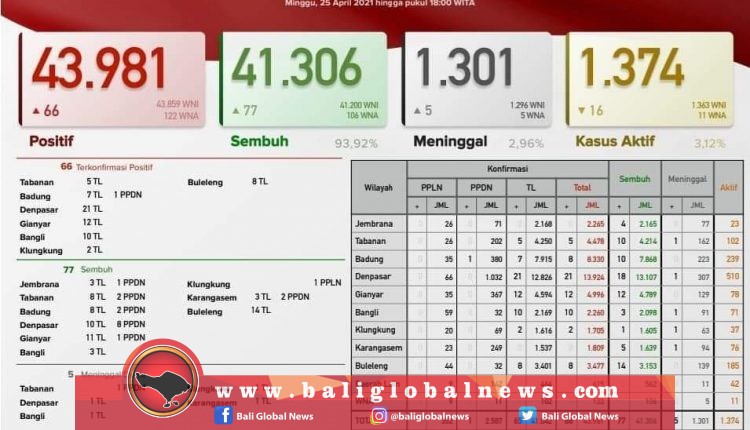 Pertambahan kasus terkonfirmasi positif Covid-19 sudah turun ke angka dua digit. Pada Minggu (25/4), kasus positif tercatat 66 orang (65 orang melalui transmisi lokal dan 1 PPDN), sembuh 77 orang, dan 5 orang meninggal dunia.