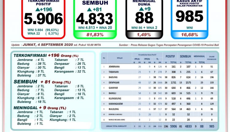 Perkembangan pandemi Covid-19 di Provinsi Bali pada Jumat (4/9) terkonfirmasi 196 orang melalui transmisi lokal, kasus sembuh 81 orang, dan 9 pasien meninggal dunia.