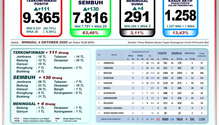 Perkembangan pandemi Covid-19 di Provinsi Bali pada Minggu (4/10) terkonfirmasi positif 111 orang melalui transmisi lokal, sembuh 130 orang, dan meninggal dunia 4 orang.