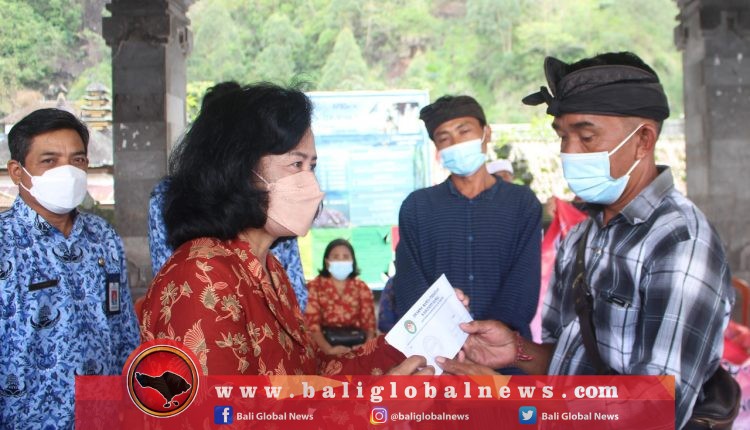 Ketua Dharma Wanita Persatuan (DWP) Kabupaten Bangli, Ny. Giri Putra, menyerahkan secara simbolis bantuan paket sembako kepada warga yang terkena musibah akibat tanah longsor di wantilan Desa Trunyan, pada Kamis (25/11).