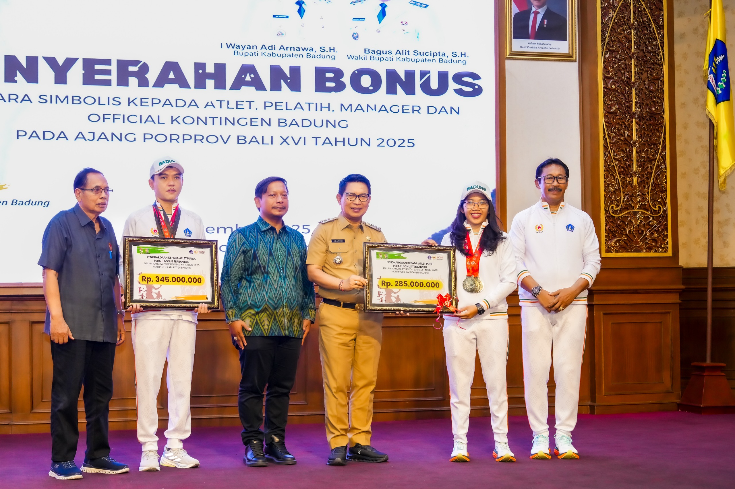 Bupati Adi Arnawa menyampaikan apresiasi tinggi atas prestasi gemilang dan perjuangan luar biasa Tim Porprov Badung yang berhasil mengharumkan nama daerah sekaligus menorehkan sejarah baru dalam dunia olahraga daerah pada Porprov Bali XVI Tahun 2025 yang sukses mempertahankan gelar juara umum untuk Ke-10 kalinya secara berturut-turut. Penyerahan bonus secara simbolis diberikan kepada perwakilan atlet Badung yang meraih medali terbanyak yaitu biliar meraih 4 emas, 2 perak, dan 1 perunggu dengan bonus Rp345 juta serta catur meraih 5 emas, 1 perak dengan mendapatkan bonus Rp285 juta.