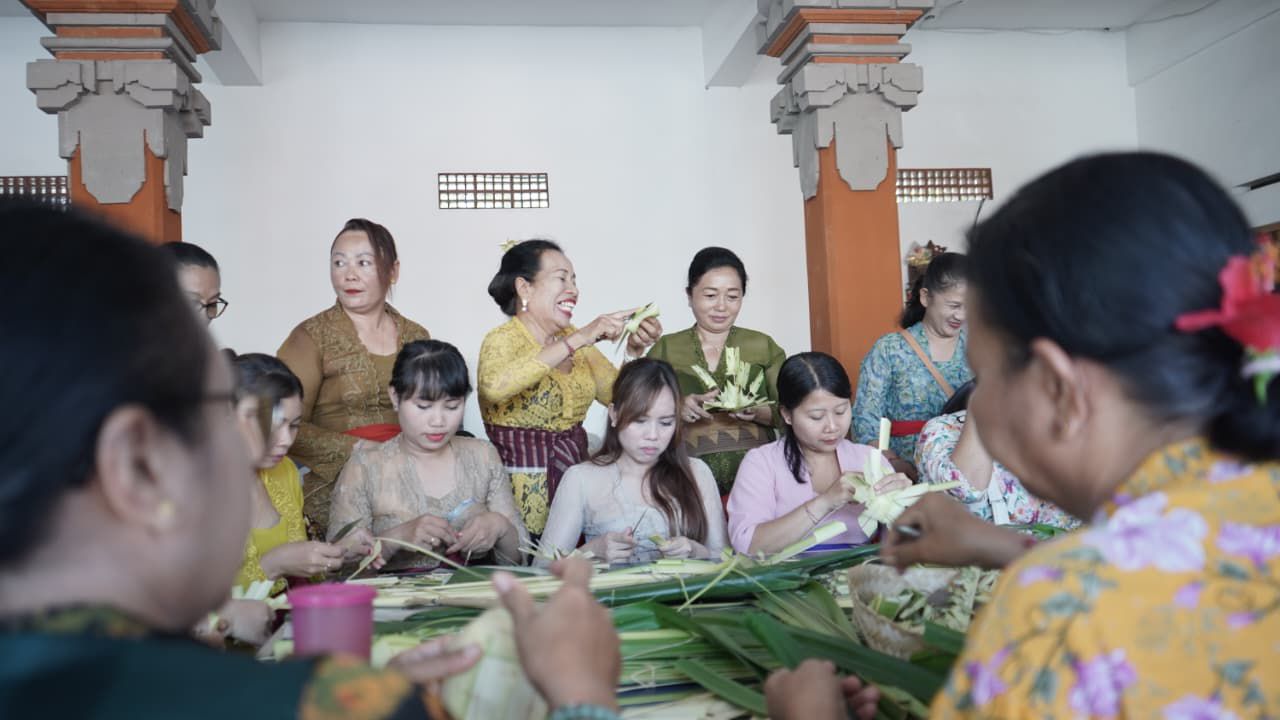 Ketua WHDI Denpasar Ny. Jaya Negara Buka Pelatihan Membuat Banten Otonan di Banjar Tatasan Kelod