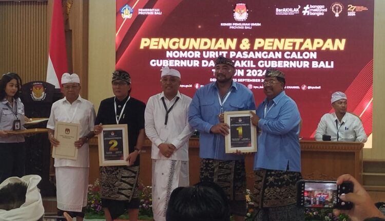 Komisi Pemilihan Umum (KPU) Bali menetapkan Wayan Koster dan I Nyoman Giri Prasta (Koster-Giri) nomor urut 2 dan I Made Muliawan Arya dan Putu Agus Suradnyana (Mulia-PAS) nomor urut 1.
