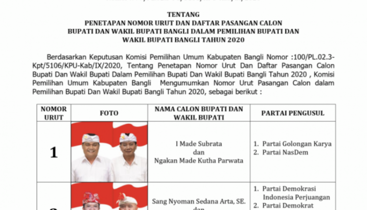 Komisi Pemilihan Umum (KPU) Bangli, Provinsi Bali, telah menggelar pengundian nomor urut pasangan calon bupati dan wakil bupati Pilkada 2020 dengan hasil yakni pasangan I Made Subrata-Ngakan Made Kutha Parwata (Bagus) mendapat nomor urut 1, sedangkan pasangan Sang Nyoman Sedana Arta-Wayan Diar (Sadia) mendapat nomor urut 2.