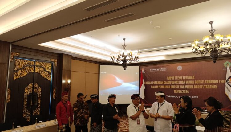 Penetapan itu dilakukan dalam Rapat Pleno Terbuka Penetapan Pasangan Calon Bupati dan Wakil Bupati terpilih Kabupaten Tabanan tahun 2024 di Hotel Homm Saranam, Baturiti, Tabanan, pada Kamis (9/1/2025). “Menetapkan Pasangan Calon Bupati dan Calon Wakil Bupati no urut 2 saudara I Komang Gede Sanjaya dan saudara I Made Dirga sebagai Bupati dan Wakil Bupati Tabanan terpilih,” ujar Ketua KPU Tabanan, I Wayan Suwitra