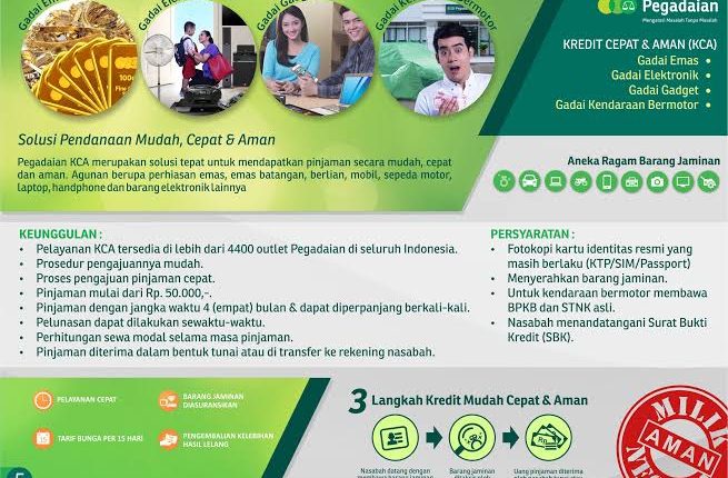 “KCA merupakan solusi terpercaya untuk mendapatkan pinjaman secara mudah, cepat dan aman.Untuk mendapatkan kredit nasabah hanya perlu membawa agunan berupa perhiasan emas, batangan, mobil, sepeda motor, laptop, handphone, dan barang elektronik lainnya,” ujar Manajer Humas PT Pegadaian Kanwil VII Denpasar, Made Mariawan, di Denpasar, Selasa (13/10/2020).