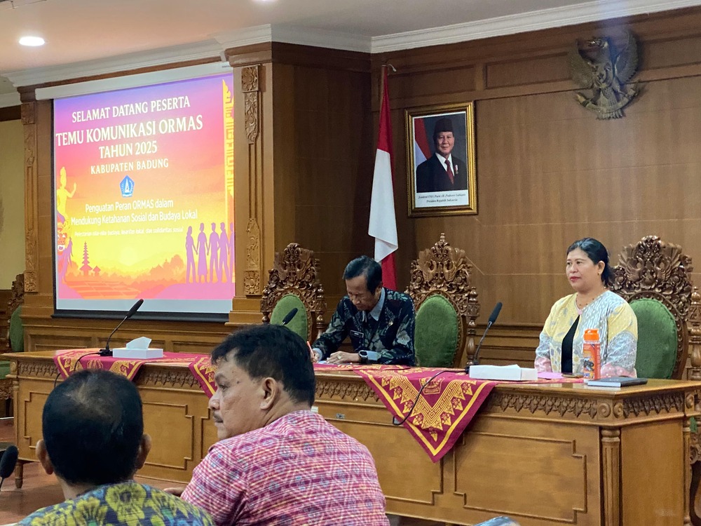 Badan Kesatuan Bangsa dan Politik (Kesbangpol) Kabupaten Badung menggelar Temu Komunikasi Organisasi Kemasyarakatan (Ormas) se-Kabupaten Badung di Ruang Kriya Gosana, Puspem Badung pada Selasa (29/7). Kegiatan ini bertujuan untuk memperkuat peran ormas dalam menjaga ketahanan sosial dan budaya lokal.
