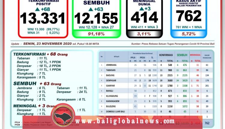 Perkembangan pandemi Covid-19 di Provinsi Bali pada Senin (23/11) terkonfirmasi 68 orang (64 orang melalui transmisi lokal dan 4 PPDN), sembuh 63 orang, dan 3 orang meninggal dunia.