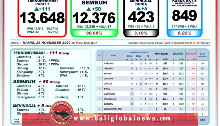 Perkembangan pandemi Covid-19 di Provinsi Bali pada Kamis (26/11) terkonfirmasi 111 orang (109 orang melalui transmisi lokal dan 2 PPDN), sembuh 50 orang, dan 5 orang meninggal dunia.