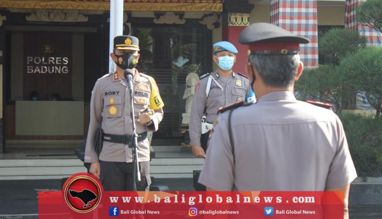 Disaksaksikan oleh para pejabat utama Polres Badung, Kapolsek Jajaran dan personil Polres Badung di lapangan hitam Mapolres, Kapolres Roby Septiadi dengan lantang mengatakan Patuhi Prokes, Terus lakukan Razia Prokes jangan sampai positif Covid -19 melebihi kapasitas rumah sakit.(bgn123)21042801