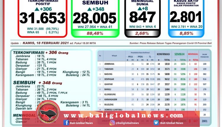 Perkembangan pandemi Covid-19 di Provinsi Bali pada Kamis (18/2) terkonfirmasi 306 orang (292 orang melalui transmisi lokal dan 14 PPDN), sembuh 348 orang dan 8 orang meninggal dunia.