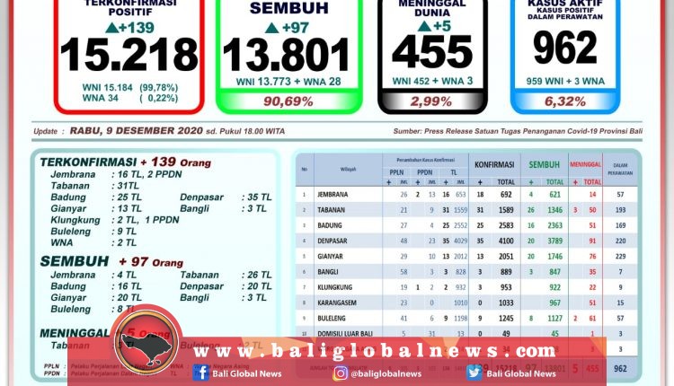 Perkembangan pandemi Covid-19 di Provinsi Bali pada Rabu (9/12/2020) terkonfirmasi 139 orang (136 orang melalui transmisi lokal dan 3 PPDN), sembuh 97 orang, dan 5 orang meninggal dunia.